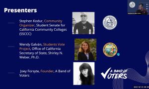 This webinar was conducted in conjunction with the California Secretary of State's Office and A Band of Voters to explain to campuses the requirements of AB 963 and the resources available to them. AB 963 (2019) was passed by the CA legislature to encourage civic engagement on higher education campuses. The Student Vote Project is housed in the CA Secretary of State's office and assists campuses with resources to enforce AB 963 on their campuses. A Band of Voters is a nonprofit organization that empowers student leaders to create civic events on campus and were a driving force behind AB 963.